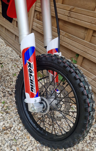 Finit les crevaisons, cette moto est équipée d'un gripster de roue à l'arrière pour bloquer la chambre à air et éviter les arrachements de valves!Coté moteur, YX qui leur fait un moteur sur-mesure 125cc démarrage point mort