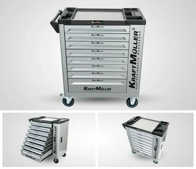Servante PRO Kraft Muller KM 8/8 TOOL noir. La construction en tôle prépeinte soudée et le plateau en acier du chariot le rendent solide et durable. Les outils en chrome vanadium sont rangés dans des tiroirs confortables avec thermoformage en mousse souple. Une porte latérale pratique vous permet de ranger les sprays et autres équipements. Cette servante d’atelier sera l’indispensable de votre garage ou de votre atelier professionnel, MECANICIEN, GARAGISTE, CENTRE AUTOMOBILE, MOTO, etc.